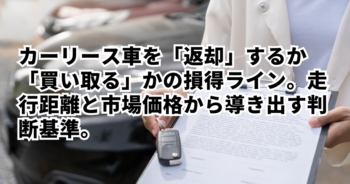 カーリース車を「返却」するか「買い取る」かの損得ラインは、現在の走行距離によるペナルティ額と、その車を市場で買った場合の価格を天秤にかけることで明確になります。原状回復費用を支払って手放すよりも、残価を支払って所有し続けるほうが安上がりなケースもあれば、逆に市場価値が下がっているなら返却して新しい車に乗り換えるほうが賢明な場合もあります。