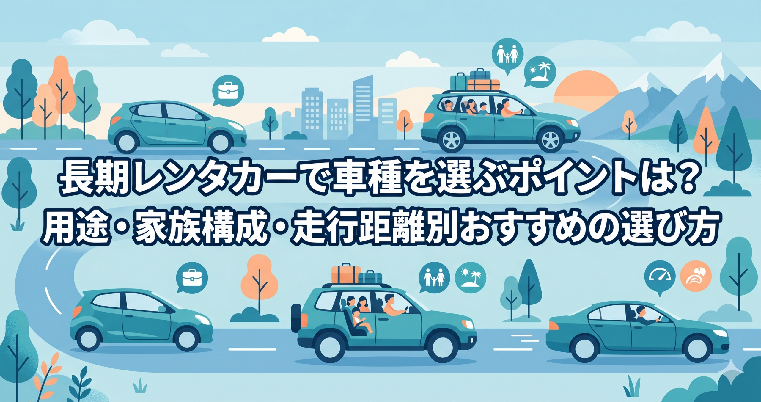 長期レンタカー(マンスリーレンタカー)を検討していると、「どの車種を選べばいいの?」と悩む方は多いのではないでしょうか。短期のレンタカーとは違い、長期レンタカーは1ヶ月以上同じ車に乗り続けることになるため、生活スタイルや用途に合った車種を選ぶことが日常の快適さに大きく影響します。車種を誤ると「荷物が入らない」「燃費が悪くてガソリン代がかさんだ」といった後悔につながることも。この記事では、長期レンタカーで車種を選ぶ際のポイントを用途・家族構成・走行距離の観点から詳しく解説します。